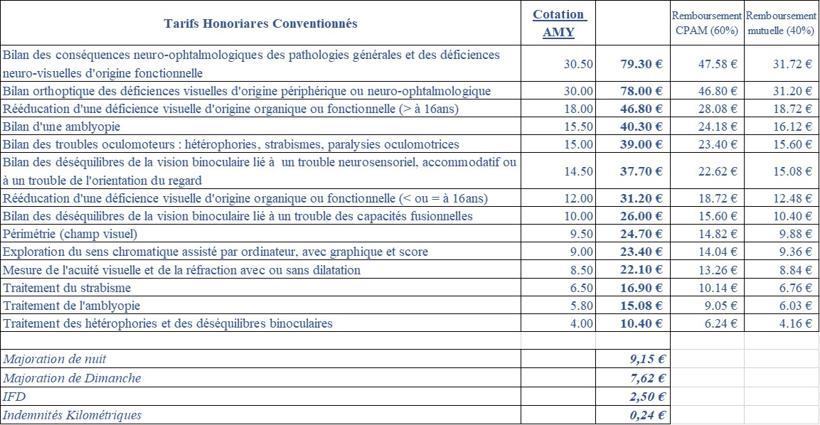 Les actes orthoptiques conventionnés (certains étant soumis à accord préalable) sont remboursés à hauteur de 60 % par la sécurité sociale, le complément est pris en charge par les mutuelles ou la CMU